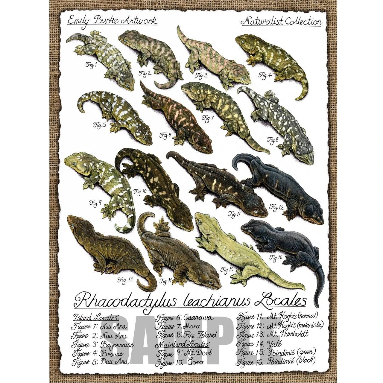 This print was made from an original illustration I completed. It features various images of the Leachianus Gecko and its locales.
