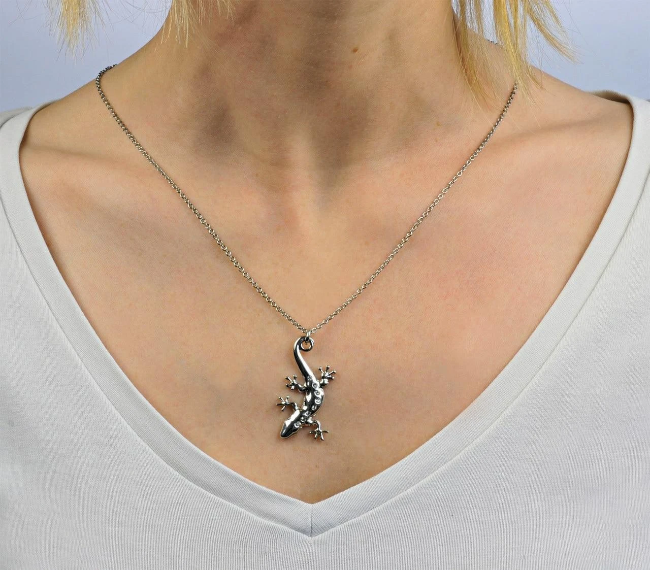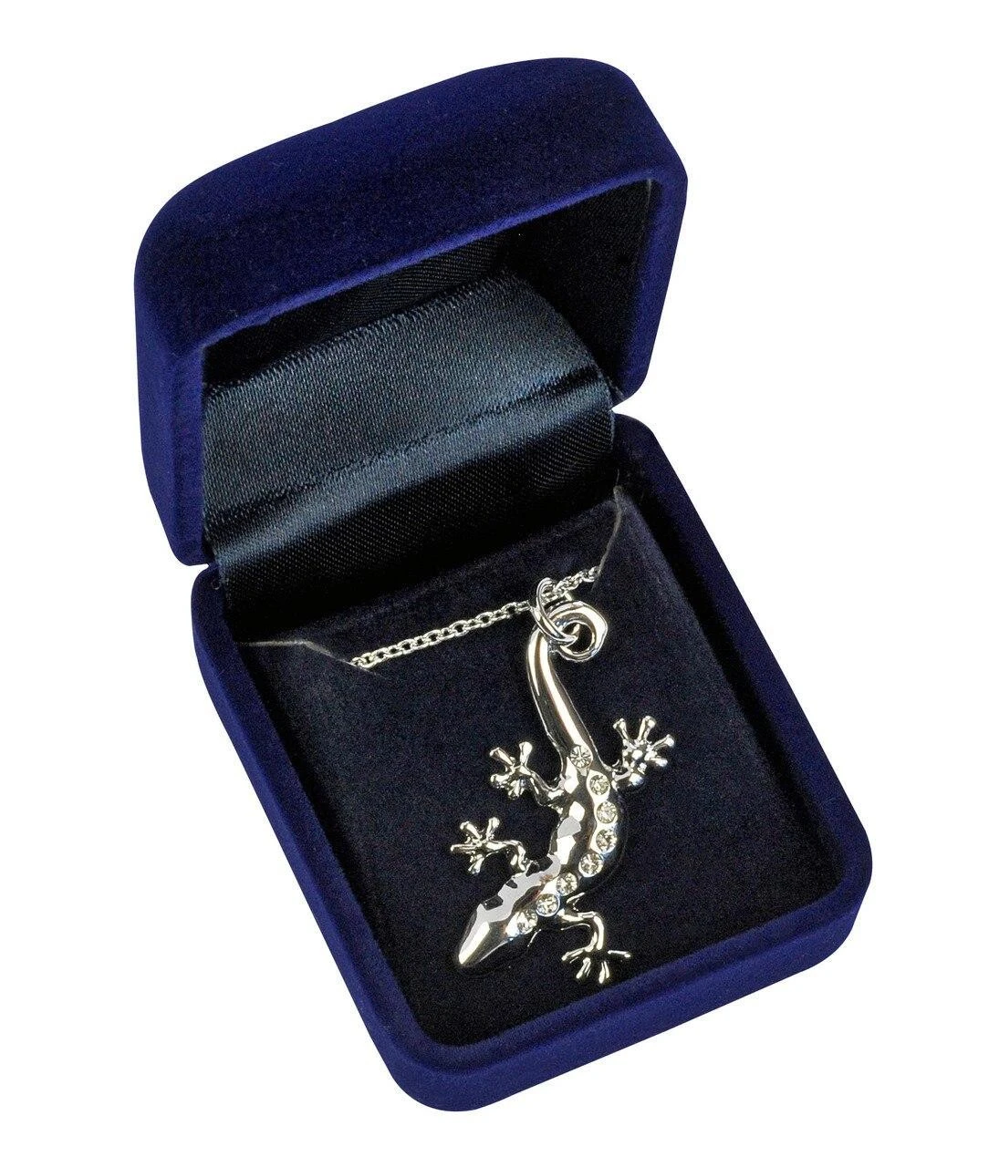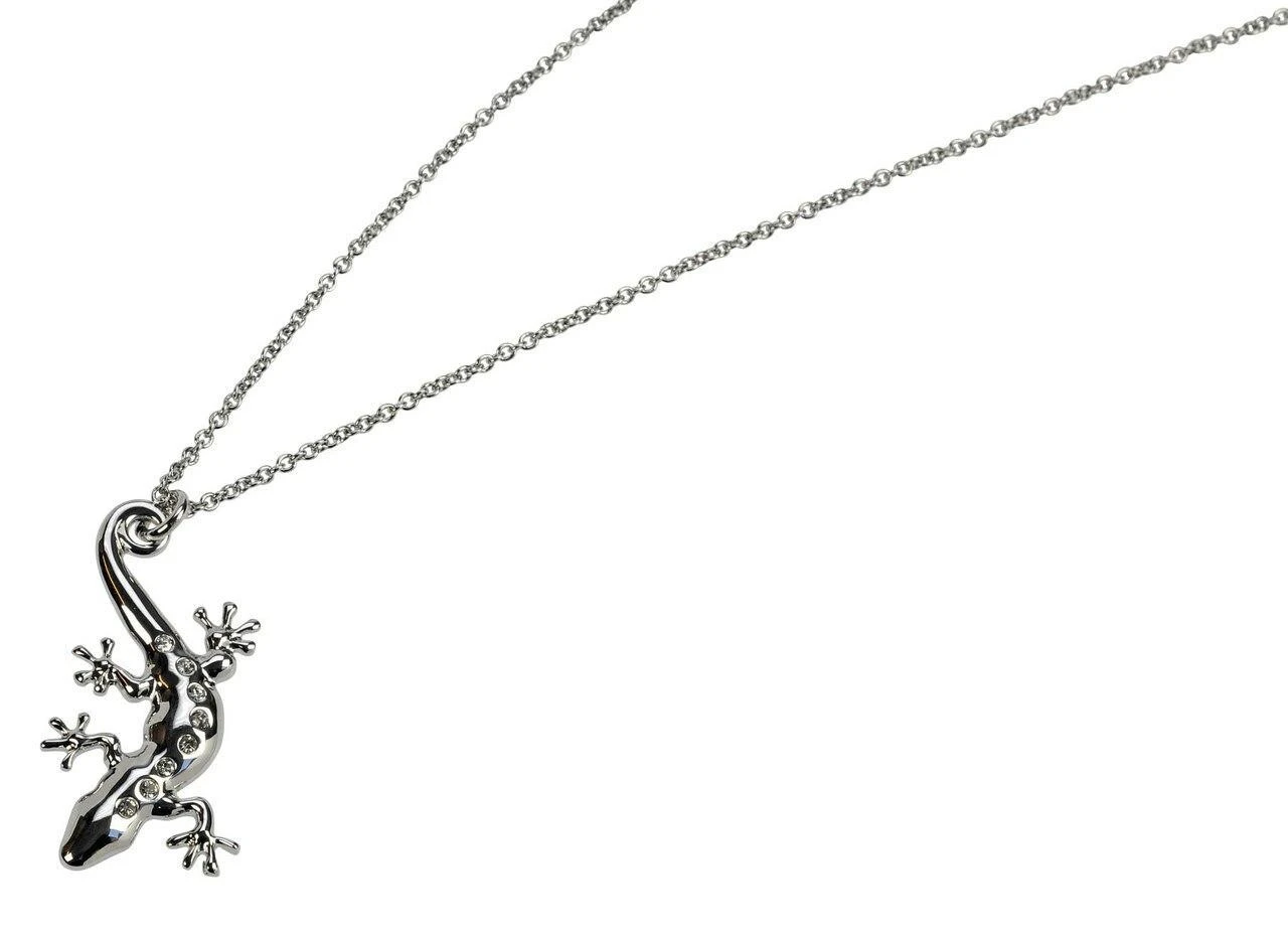 Silver-coloured, nickel-free necklace (46 cm) with one-sided three-dimensional gecko pendant, adorned with eight sparkling rhinestones. Delivery in velvet jewellery case (4.8 x 5.7 x 3.5 cm).