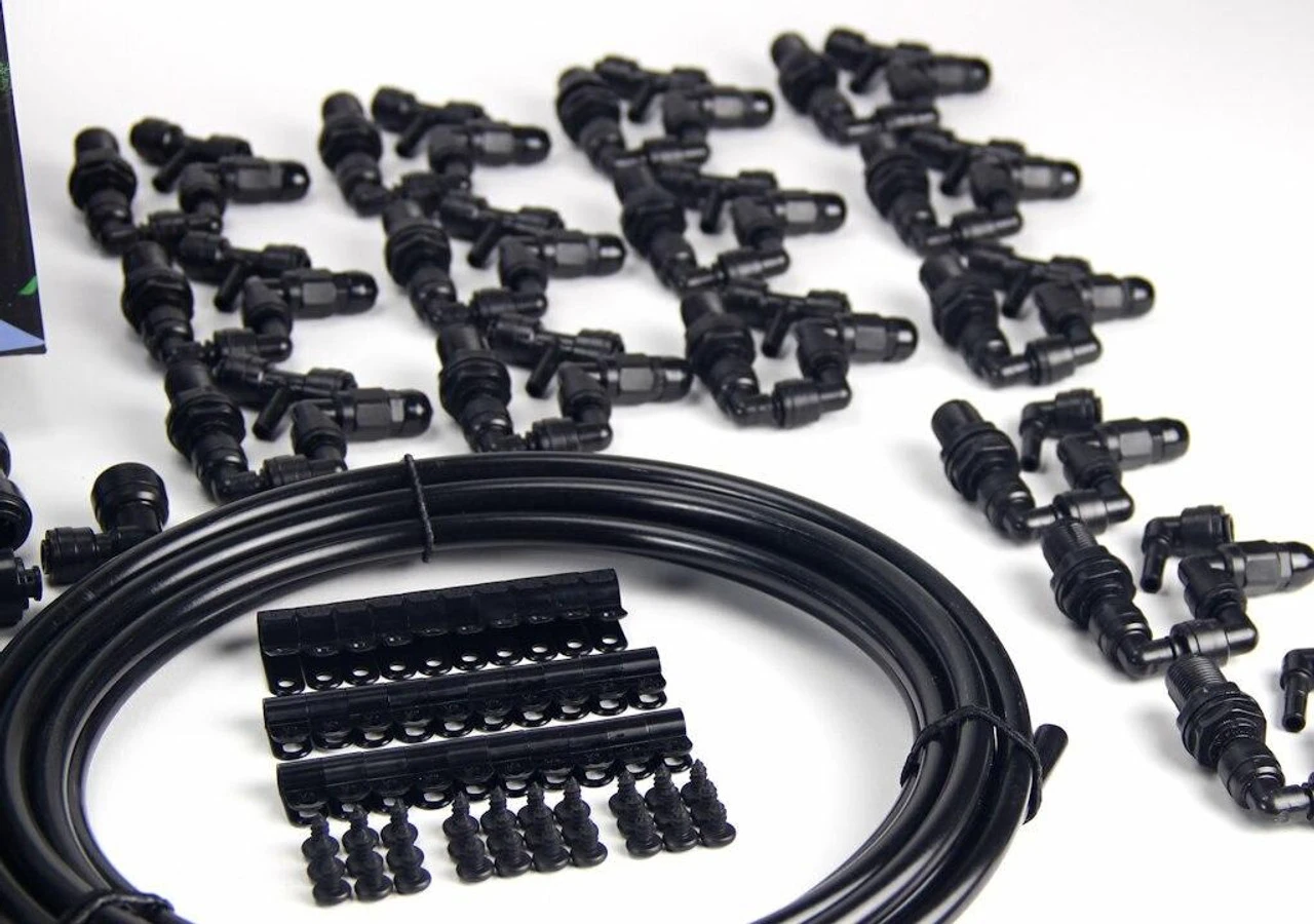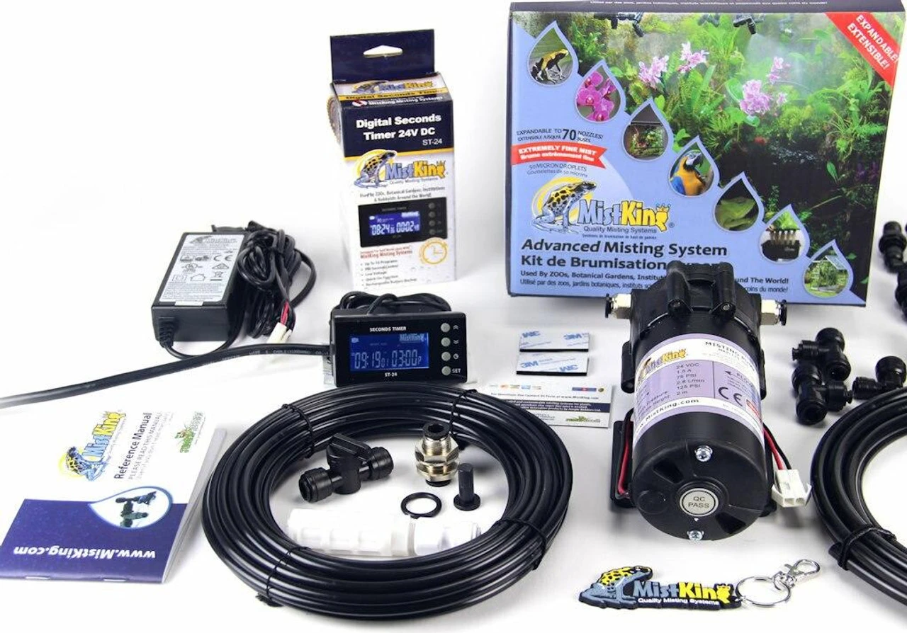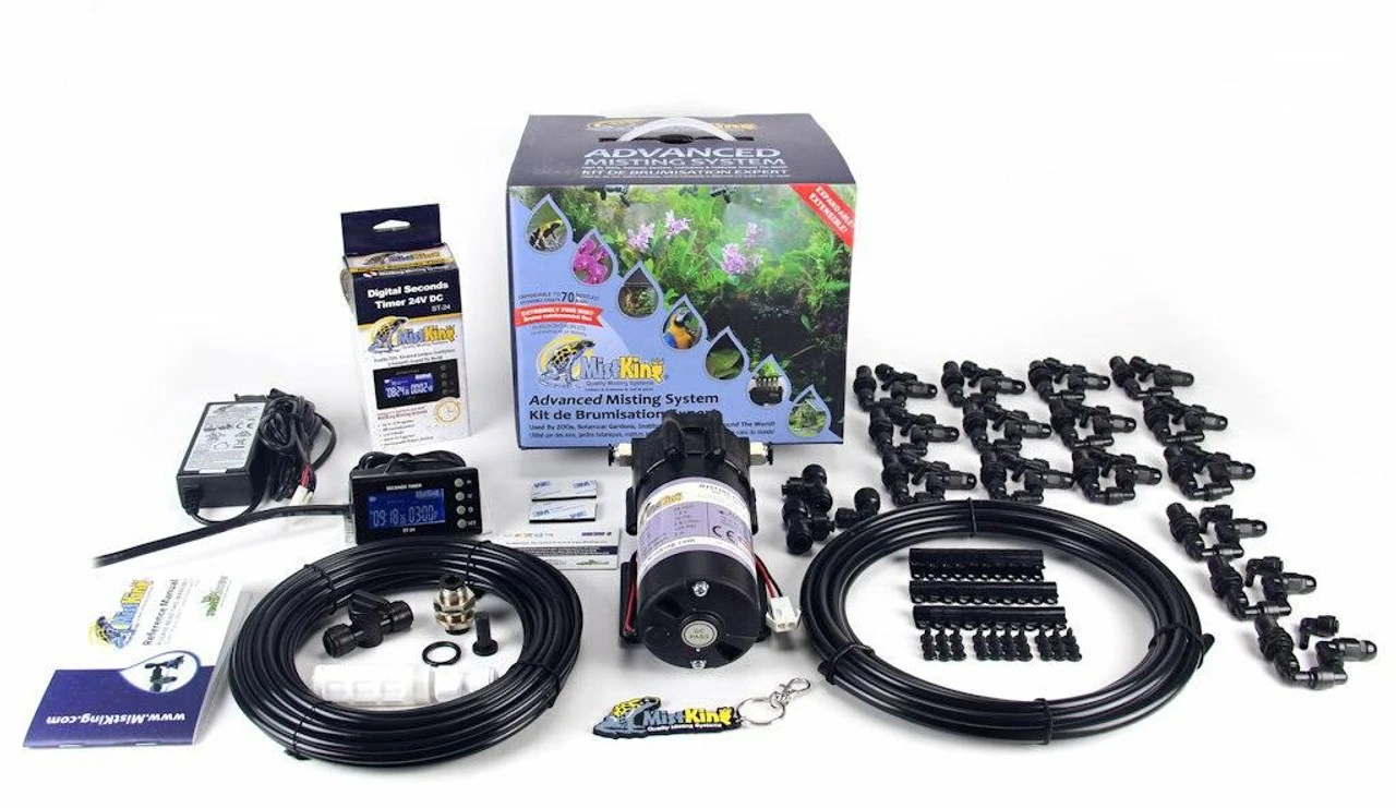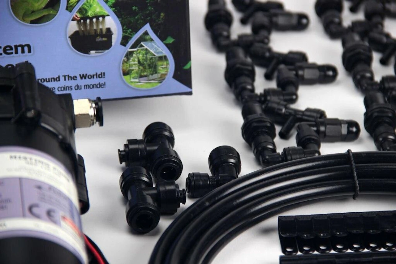 This Advanced Misting System v5.0 includes Advanced Misting System with a 3/8″ Backbone is a significantly more powerful system than the starter or ultimate. Unless you’re going to exceed 15-20 nozzles, we do not recommend upgrading to this misting system. Features a pump capable of pressures up to 125psi. Supports from 10 to 70+ nozzles of your choice. Actual number of nozzles depends on the complexity of the system. Pump can run continuously for hours at a time, EVEN DRY! These pumps are manufactured specifically for MistKing and are very robust.